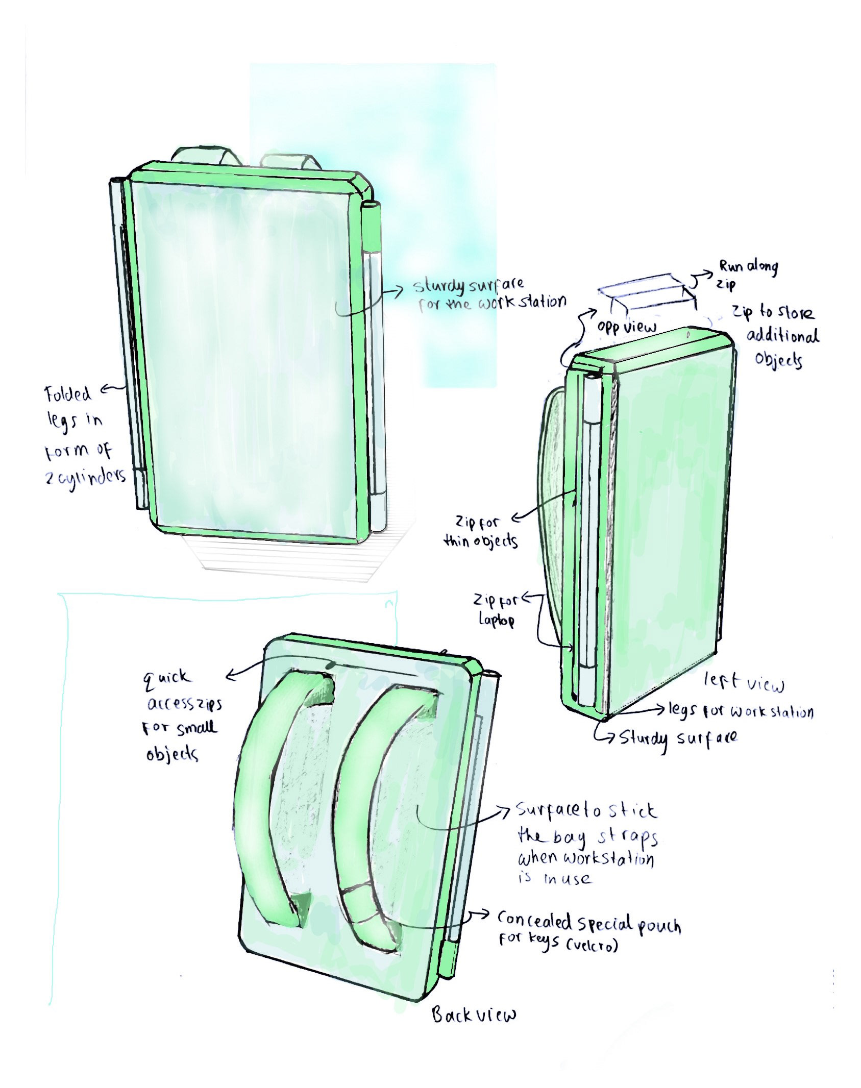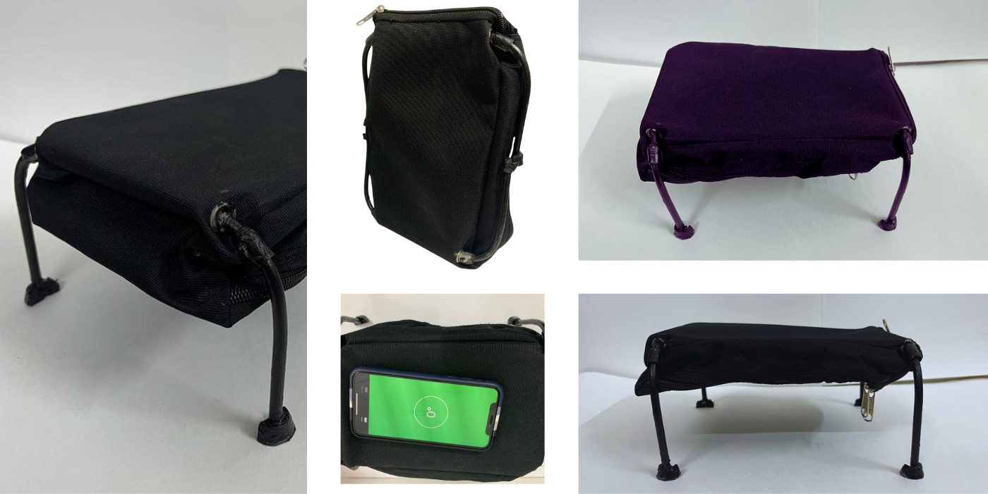 The reduced 1:4 scale mockup can withstand weights of up to 4 kg. Its legs seamlessly attach to the side for backpack mode, and unfold into a table when required, optimizing versatility and functionality.